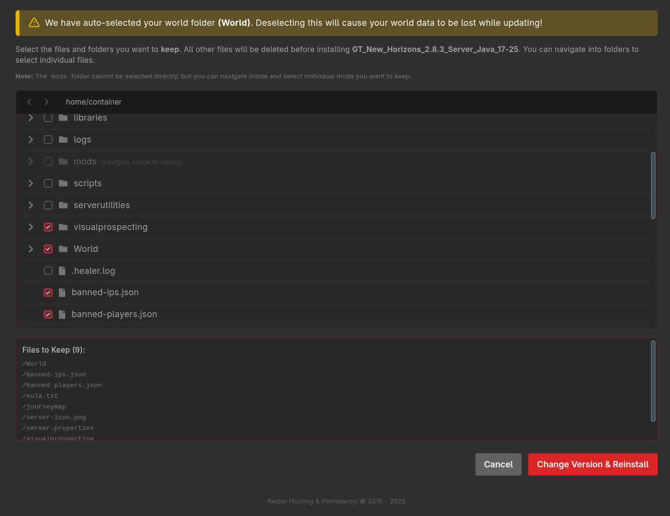 Selecting the entire mods folder is intentionally disabled because during the upgrade the new mods will be populated from the new server pack. You should not attempt to keep any mods that are included with the base pack. The only exception to this may be if you’re replacing mods with experimental/other versions of mods, in which case you will need to keep the mod and then delete the one that comes with the modpack after reinstallation.