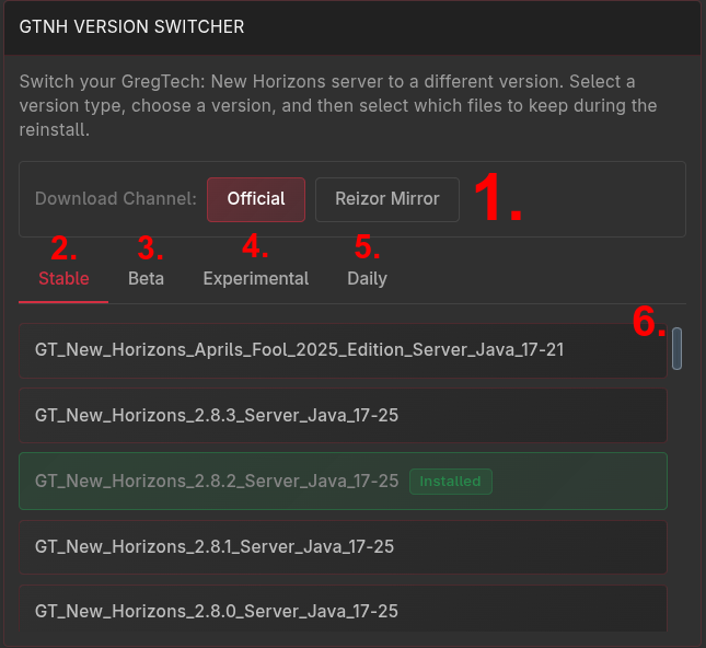 - This is where you can select the download source for the Stable and Beta channels. The Official is pulled from downloads.gtnewhorizons.com and the Reizor Mirror pulls from our mirror that resides within our intranet. It’s recommended to use our mirror for most cases due to the increased download speeds, but either should work, assuming the official downloads server isn’t experiencing network issues.